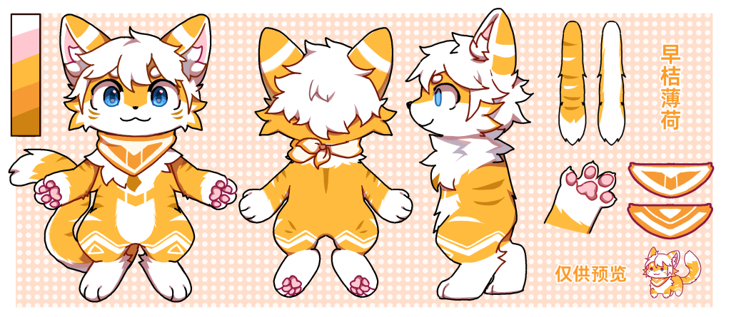 “早桔薄荷”出生了 2024-1-12 7:13 | 2024-9-03 19:03 | 156 | 0 88 字 | 1 分钟内 此设定原型为桔子猫,在部分绘制过程允许画师进行特定简化 纹理只要绘制表现没有问题即可,不强制要求按照设定图完全原位复刻纹理 三角巾为可选配件,绘制时根据情况进行添加 禁止盗用!